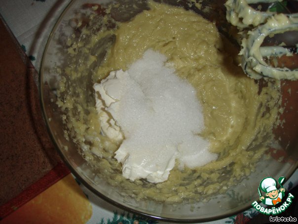 Добавить масло и cream cheese (маскарпоне).Взбить миксером.