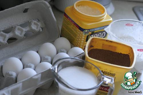 Приготовим все ингредиенты для бисквита. Часть муки (где-то 1/3 стакана) я заменила крахмалом, тогда бисквит получается более воздушным, но это необязательно, он и без того получается хорошим,