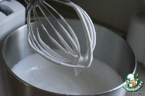 белки отделяем от желтков и взбиваем, постепенно добавляя сахар, на максимальной скорости миксера до крепкой пены.
