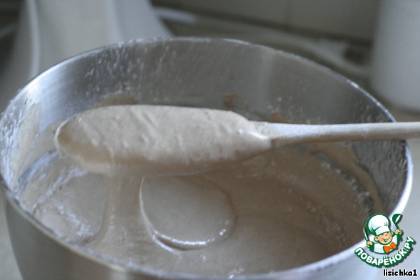 ... и перемешиваем деревянной лопаточкой осторожно снизу-вверх, пока вся мука не войдет. Добавляем какао,