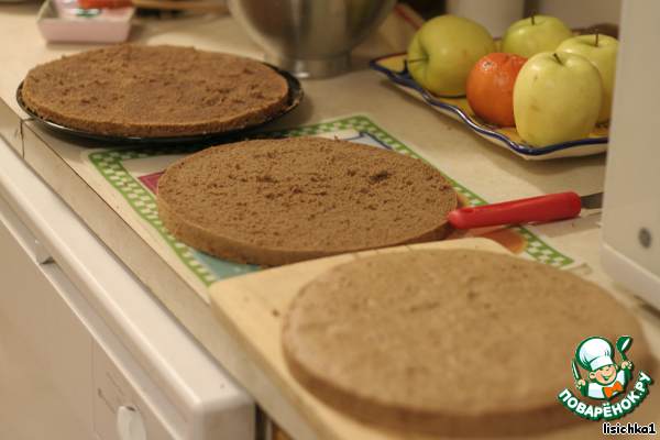 Бисквит разрезаем на три части. Каждую я слегка пропитала ванильным сиропом, но это необязательно. Две нижних части намазываем кремом.