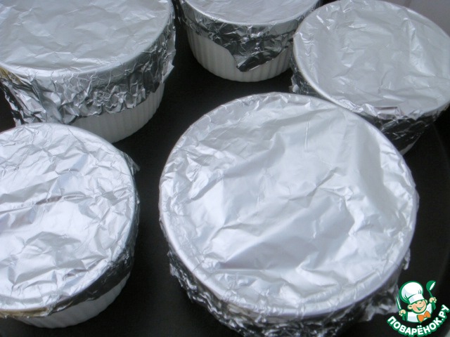Каждый рамекин сверху накрыть одним слоем фольги и запекать в разогретой до 220 градусов духовке 40 минут.