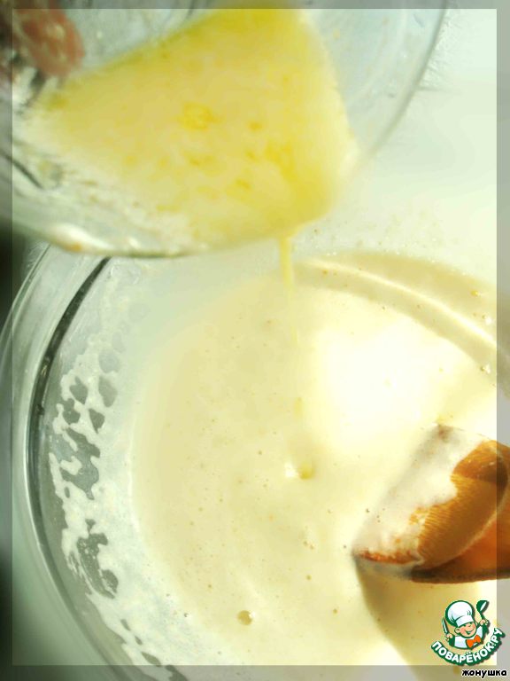 Потихоньку вводим растопленное остывшее сливочное масло. Хорошо перемешиваем - уже не миксером, вручную.