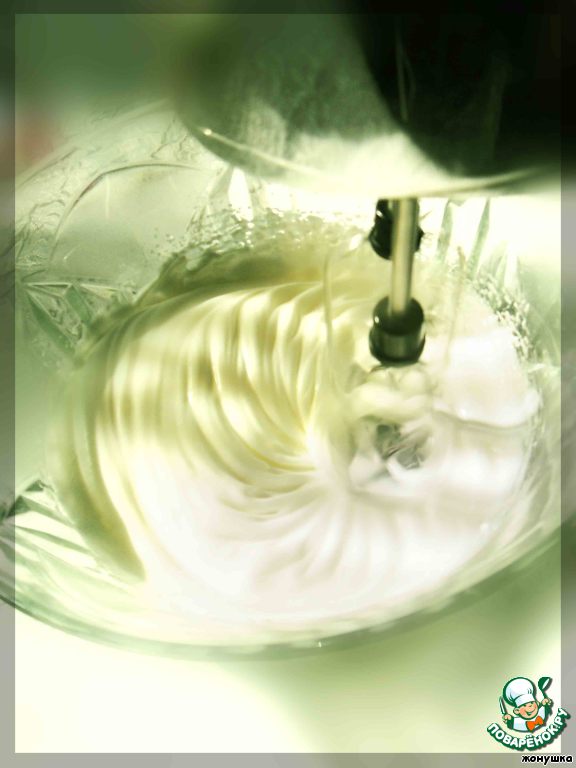 Берем два яйца из четырех и 50 г сахарной пудры, взбиваем в пышную массу.