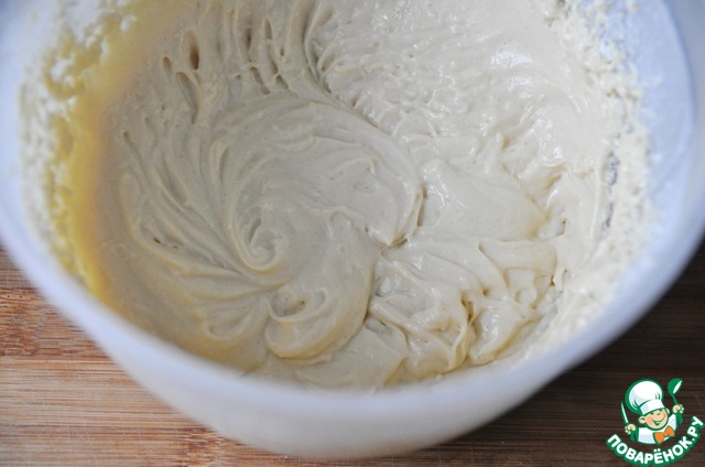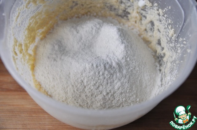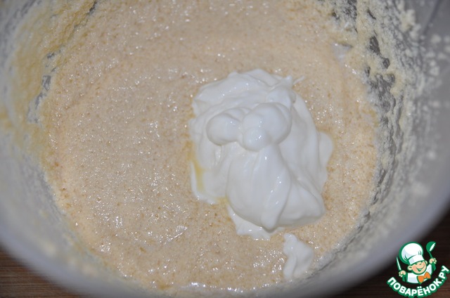 Вводим половину сметаны и половину просеянной с разрыхлителем муки, всё хорошо перемешиваем.