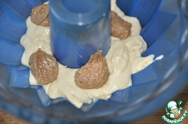 Кладём 1/4 части теста в форму. Сверху кладём по пол-ложке коричного теста.