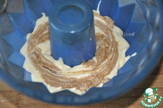 Далее опять наливаем 1/4 теста, а сверху кладём коричное тесто и опять делаем ножом разводы.
