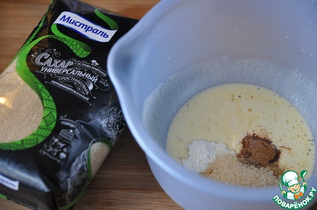 Масло растапливаем в микроволновке или на водяной бане, добавляем сахар универсальный от "Мистраль", муку, корицу и ванилин.