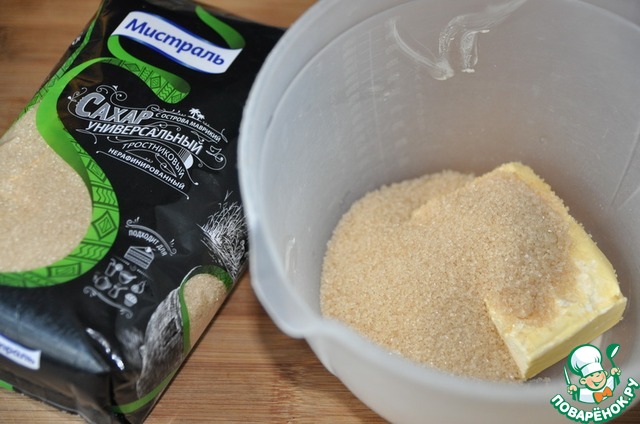 Берём сливочное масло комнатной температуры, добавляем сахар универсальный от "Мистраль", взбиваем миксером около 5 минут до получения кремовой воздушной массы.