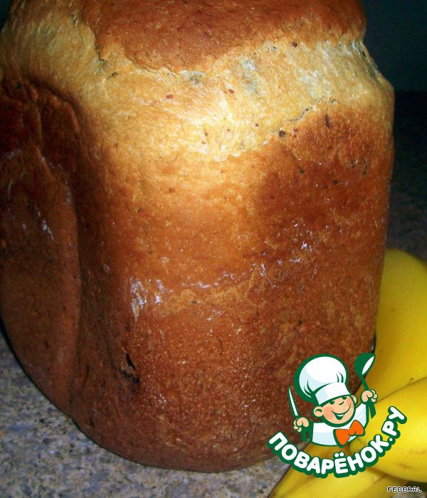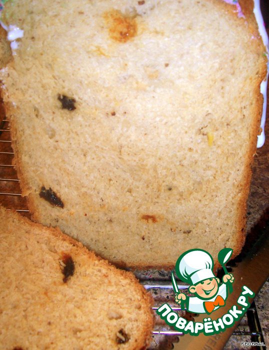 Выливаем в хлебопечку, всыпаем сухое молоко, творог, вливаем растительное масло, потом мёд, соль и 2 ч.л дрожжей сухих без горки, изюм, без воды в которой парили, включаем на режим 3 часа, и просеиваем муку - сначала 500 г, когда перемешает и ещё липнет к стенкам добавляем ещё 100 г муки.
