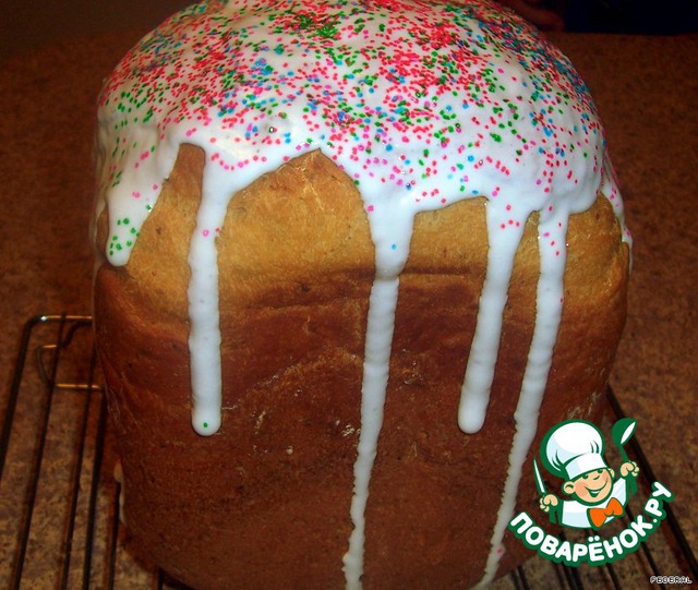 Готовый кулич остудить, 1 белок взбить с 100 г сахарной пудры и помазать, посыпать разноцветной посыпкой.
