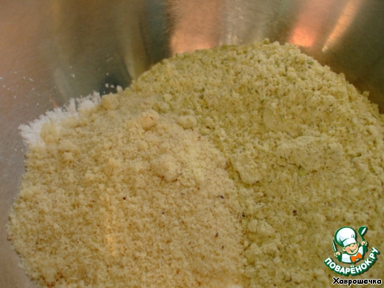 Вначале нужно сделать миндальную и фисташковую муку. Как делать миндальную муку, если нет готовой, написано не мало. Я брала покупную. Фисташковую муку я делала по такому же принципу. Несоленые фисташковые орехи (65 г) я перемолола в чашечном блендере со 125 граммами сахарной пудры. Небольшими порциями, чтобы орехи не перегрелись, не выделили масло и не превратились в фисташковую пасту)).