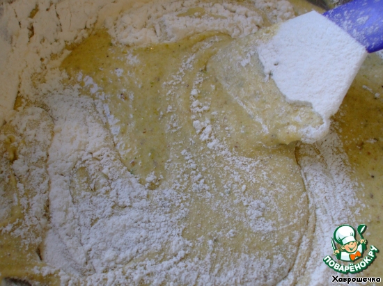 Аккуратно в три приема в фисташковое тесто примешайте просеянную с разрыхлителем муку и взбитый белок, перемешивая очень аккуратно лопаткой. Часть муки, часть белка, часть муки, часть белка, мука и опять белок – чтобы сохранились пузырьки воздуха. Я муку ввожу, просеивая ее через ситечко сверху на тесто.