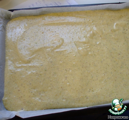 Равномерно распределить тесто по противню (у меня 39 см на 28 см), застеленному пергаментной бумагой. Толщиной около 1 см.