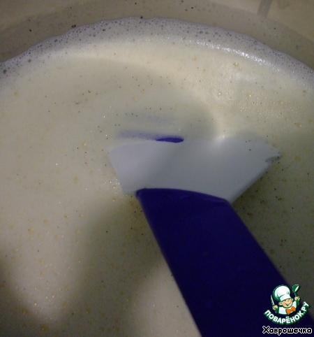 Смесь по рецепту нужно нагреть до 103С, затем снять с огня и остудить до 50С. Девочки, этот момент я не просекла.)) Есть у меня кухонный термометр, и при 103 градусах это у меня бы кипело. Или термометр у меня какой не такой? Что я сделала – просто довела смесь практически до точки кипения, беспрестанно помешивая и не давая закипеть, быстро сняла с огня, поместила кастрюлю в миску с холодной водой, еще некоторое время поперемешивала и только потом облегченно вздохнула. Остудить до 50 градусов? Здесь я даже и мудрить не стала: остудила до температуры, когда еще горячо пальцу ))), но уже терпимо.