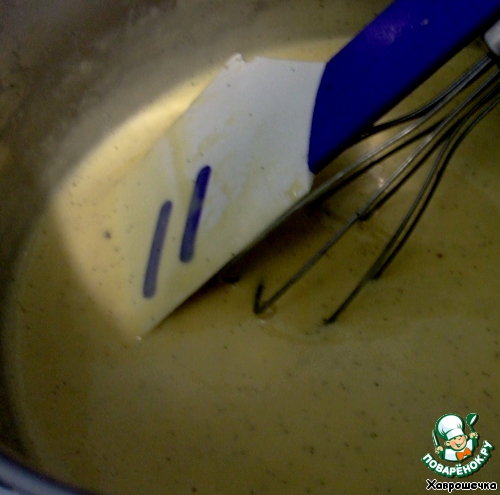 Перелить все обратно в кастрюльку и вернуть на маленький огонь. Варить, постоянно мешая венчиком, до тех пор, пока смесь не достигнет 85С. Для не имеющих кухонного градусника: девочки, просто делаем все то же, что делается при приготовлении обычного заварного крема. До кипения не доводить! просто смесь должна загустеть. Повторяю: как будто бы обычный заварной крем.