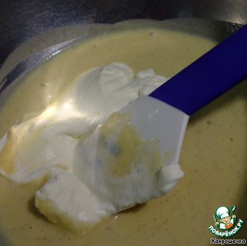 Аккуратно, чтобы масса не осела, добавить в три приема взбитые сливки, перемешивая лопаточкой снизу вверх и по кругу.