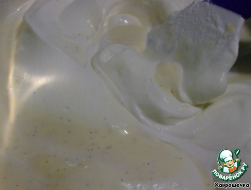 Взбить сливки - 275 г. Когда крем охладится (но не начал густеть), переместить его в миску большего объема. Понемногу, в три приема, добавить в него взбитые сливки, аккуратно перемешивая лопаточкой снизу вверх и по кругу.