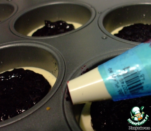 На Баварский мусс с помощью кондитерского мешка выдавливаем в центр черносмородиновое желе.