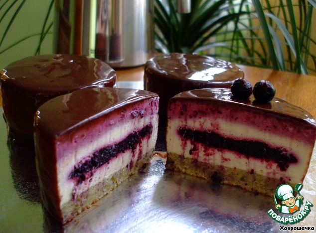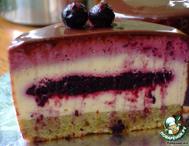 Восхитительное пирожное, девочки! Поверьте мне на слово! Если вы, конечно, любите муссы! Мягкость ванильного баварского мусса и свежий ягодный всплеск – абсолютно восхитительно! Этот бисквит – это просто фантастика! Обрезки я ела, ела, ела….не могла насытиться и остановиться – наркотик, пардон, какой-то!))) Шоколадное желе, хоть и мягкое, но прекрасно держится на пирожных, и даже если к нему прикоснуться, следы практически не видны на сияющей поверхности. Прекрасная, очень гармоничная симфония, а не пирожное.