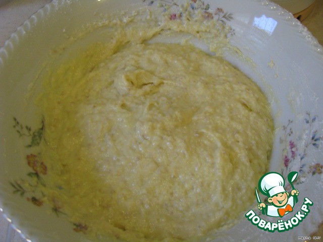 Перемешиваем муку, яйца, сахар, масло растительное, дрожжи, теплое молоко, разрыхлитель.