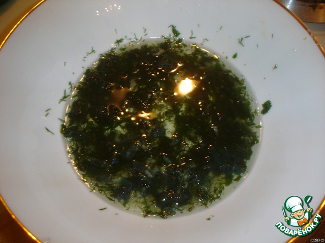 Возьмем масло растительное примерно 100г, добавим 2 дольки чеснока (выдавим) и порубленную петрушку с укропом. Отставляем в сторону. Пусть масло настоится.