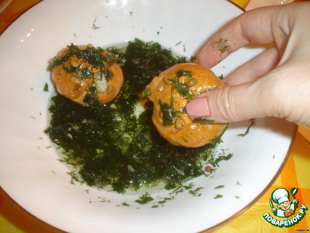 Несколько булочек опустим в нашу чесночную смесь и хорошо обваляем их там. Сложить на подносе.