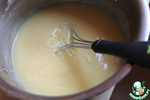 Делаем сначала крем: у всех, наверно, свой рецепт заварного крема, я сильно с ним не вожусь, у меня кастрюлька с толстым дном, поэтому я беру яйца, смешиваю с сахаром, мукой, крахмалом и добавляю молоко, все хорошо размешиваю и ставлю на маленький огонь. Постоянно помешиваю варю до загустения, затем убираю на холод. Когда остынет взбиваем масло комнатной температуры и добавляем крем, он должен быть такой же температуры. Все взбиваем.
