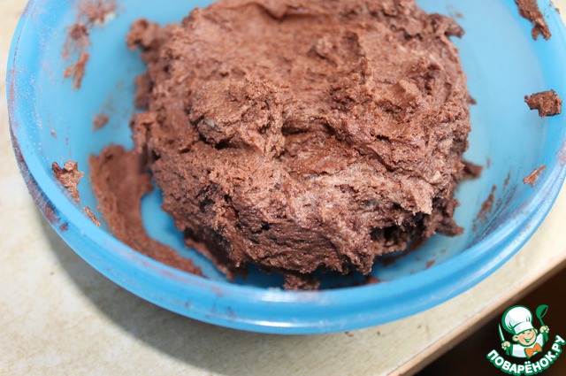 В одну часть добавим 3 ст. л. какао и 3 ст. л. муки, замесим и поставим в морозильную камеру.