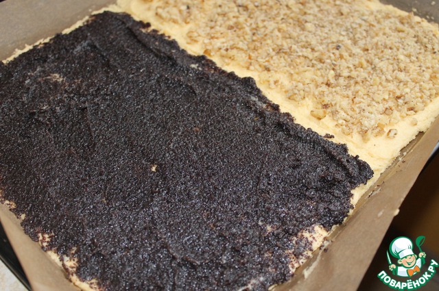 А теперь самое главное: на одну часть намазываем готовую начинку с мака, на другую берем молотый орех. Мак если нет готового, то можно сделать самим:200гр макa - проварим с небольшим количеством воды, перемалываем на мясорубке, добавим полстакана сахара, желток, 3 ст. л. муки, 1 ч. л. разрыхлителя, взбитый белок.
