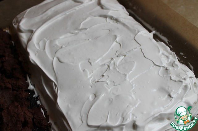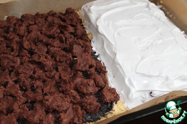 Взбиваем белки с сахаром, кто не любит сладко сильно, то можно убавить здесь сахар. Выкладываем на вишню.