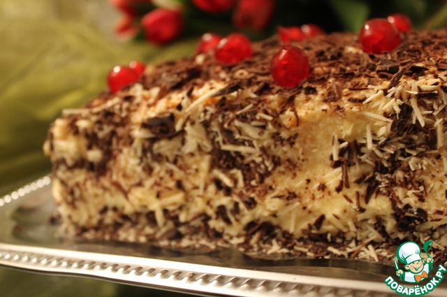 Обсыпаем верх и бока шоколадом, у меня тертый белый и темный вместе, и украшаем вишней. Ну это на ваше усмотрение. Даем обязательно пирогу настояться. Пляцок делают на большие гулянья, на свадьбы, и делают заранее. Поэтому чем дольше он будет стоять тем лучше. Затем нарезаем на кусочки и угощаемся! Приятного аппетита.