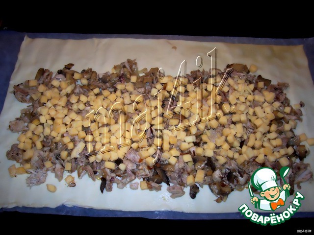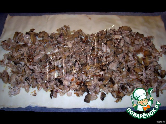 На слоёное тесто выложить курицу с грибами.