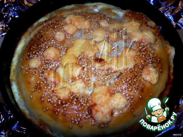 Присыпать кунжутом и положить немного сыра.