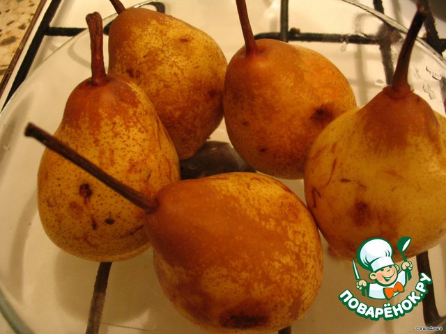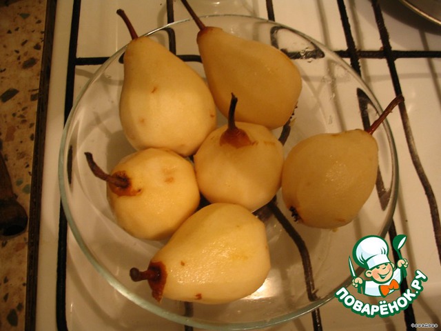 Разрезаем груши попалам и удаляем косточки. Черенок тоже нужно разрезать пополам - для этого сначало разрезайте черенок а потом всю грушу. Резать удобнее острым ножом.