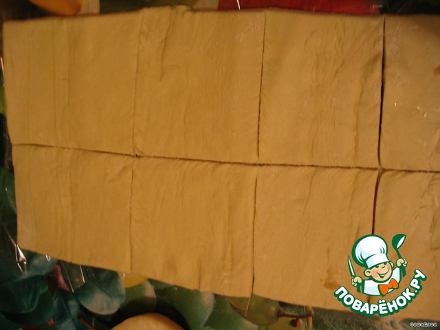 Груши мы приготовили наполовину, сейчас занимаемся тестом. Разрезаем лист теста на 12 квадратов. Если груш меньше или они очень крупные, то квадратов нужно сделать меньше.
