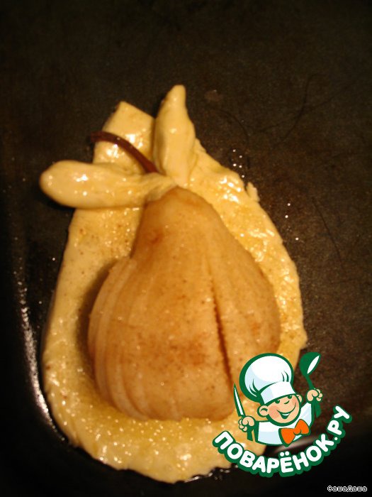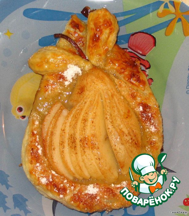 Выкладываем груши веером на каждую фигурку, посыпаем сверху сахаром и корицей. Из оставшихся уголков теста делаем листочки, окунаем их так же в яйцо и прикрепляем к черенку. Все, груша готова!!!