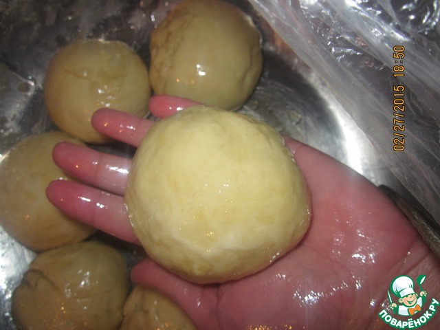 После того как наше тесто отдохнуло, достаем его и руками отрываем 7 шариков конечно можно и отрезать ножом, в пиалу наливаем масло-оно нам нужно для смазывания