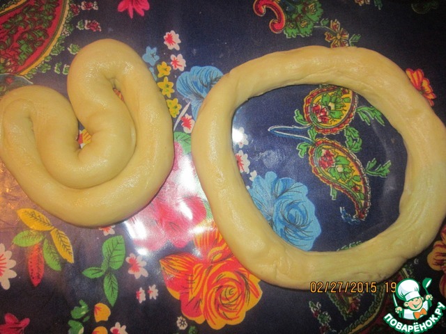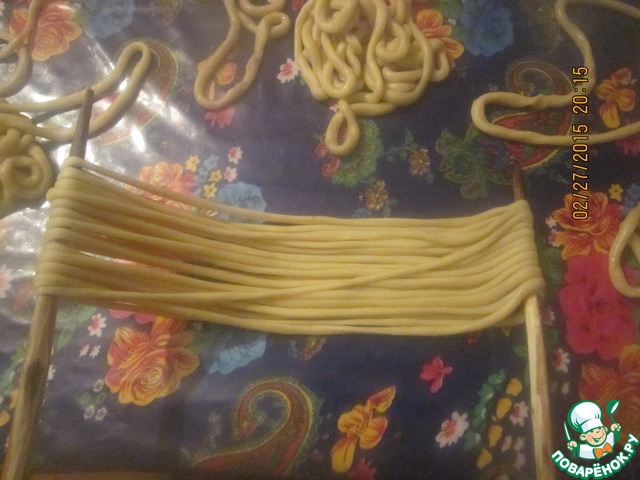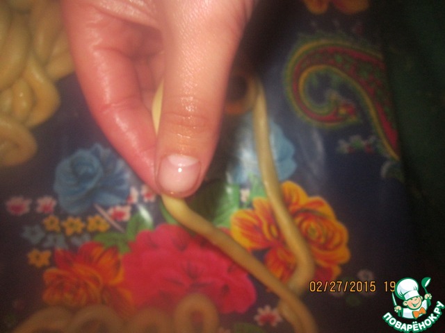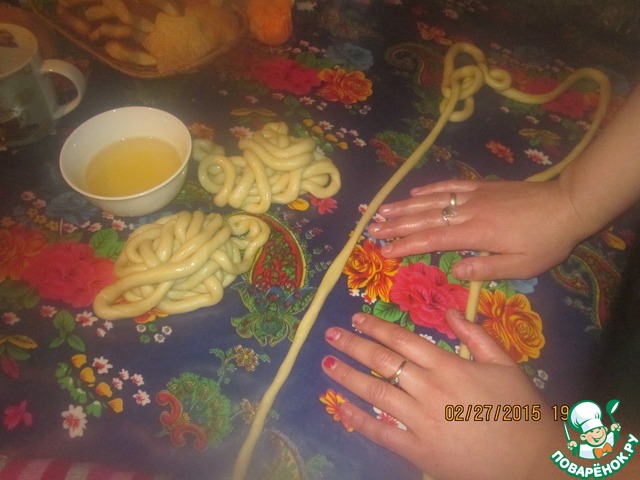 Берем первый наш кружок и аккуратно ладонями обеих рук начинаем раскатывать в длинные жгутики.. толщиной в безымянный пальчик. делается это осторожно не торипитесь потому как можно порвать тесточко как видите жгутик у меня цельный (надеюсь по фото все понятно) и можно уже поставить масло нагреваться