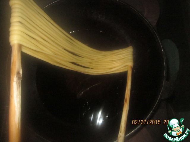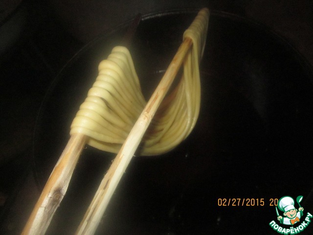 И убедившись что масло горячее сначало опускаем один конец в масло, буквально на пару секунд, затем второй конец и затем середину делается это для того чтобы тесто немного схватилось и в последствии когда будем скручивать санзы чтобы жгутики не склеились межу собой