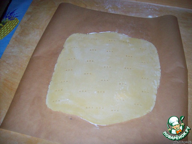 Тесто делим на 8 частей и раскатываем, подсыпая на поверхность муки в тонкие лепёшки, размером с большую тарелку, накалываем вилкой, я раскатываю на листе бумаги для выпечки, на которой потом выпекаю до светло-золотистого цвета.