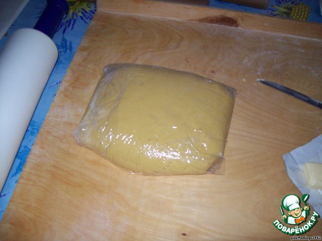 Даём массе остыть примерно до 30°и постепенно всыпая муку, замешиваем тесто, уходит около килограмма, тесто должно получиться мягкое, эластичное, чуть липнущее к рукам, приятное такое. Заворачиваем тесто в пищевую плёнку и оставляем отдохнуть.
