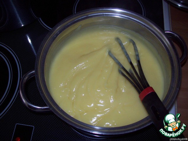 Пока тесто отдыхает, мы готовим крем. Для этого смешиваем в кастрюле сахар (полтора стакана(я беру чуть больше стакана)) муку, крахмал и яйца, хорошо перемешиваем массу. Молоко наливаем в маленькую кастрюльку и ставим на огонь, доводим до кипения. Горячее молоко вливаем тонкой струйкой в яично-мучную-сахарную смесь постоянно мешая венчиком.