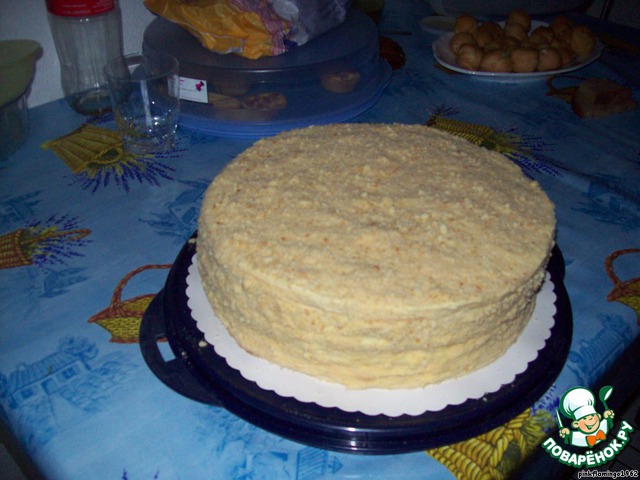 Верх и бока торта обсыпаем крошкой, которую готовим из обрезков. Осталось только дать торту пропитаться-лучше ночь. И можно наслаждаться вкусненьким тортиком с чаем или кофе!