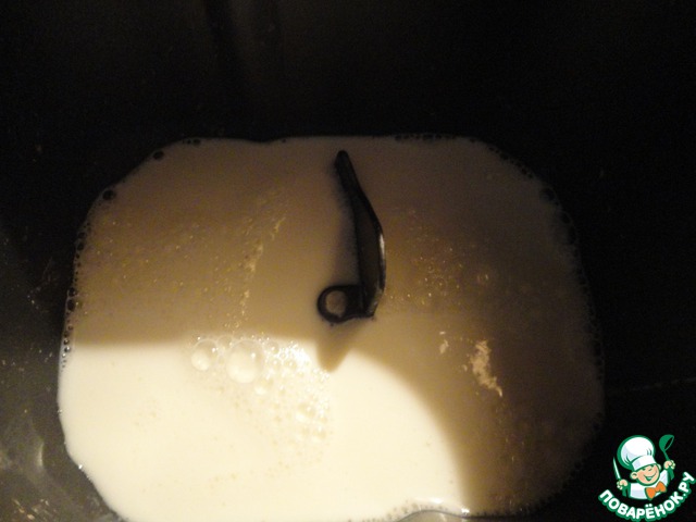 По инструкции к моей хлебопечке в нее сначала загружаются жидкие продукты, а затем сухие. Наливаем в чашу хлебопечи молоко. Добавляем соль.