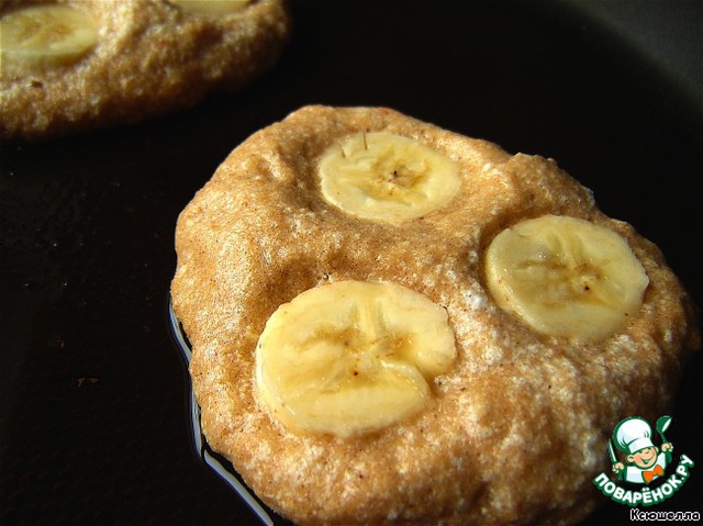 На сковороде разогреваем масло и выкладываем смесь по 1.5 столовые ложки. Сверху слегка вдавливаем по 3-4 кружочка бананов.
