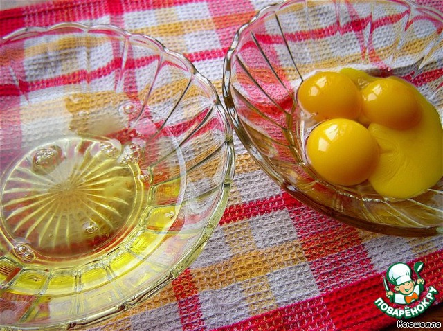 Прежде всего осторожно отделяем белки от желтков. Яйцо желательно разбивать о плоскую поверхность, чтобы избежать разрыва желтка и его попадания в белок.