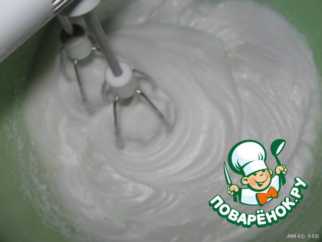 В итоге у нас должен получиться густой белковый крем (как на безе). Взбивать продолжаем, не останавливаемся.