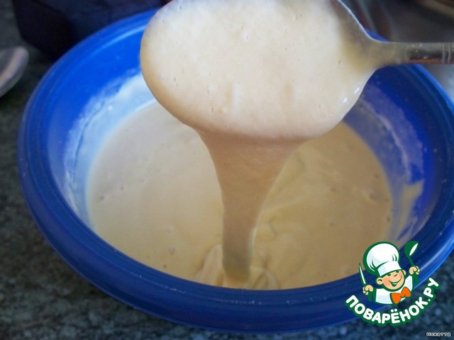 Добавить соль, соду, муку и всё хорошо перемешать (я использовала миксер). Тесто получается, примерно, как на оладьи. Дать постоять минут 30.