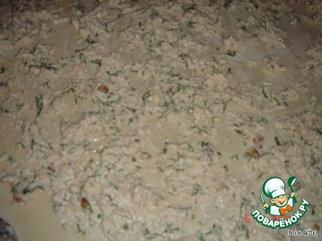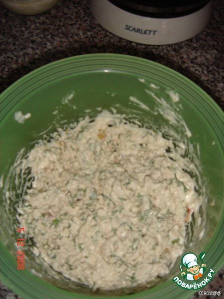 приготовить начинку: мелко нарезать отварное куриное филе, слегка обжаренные орехи (у меня фундук), укроп, мелко нарезанный чеснок, посолить, поперчить и заправить майонезом.